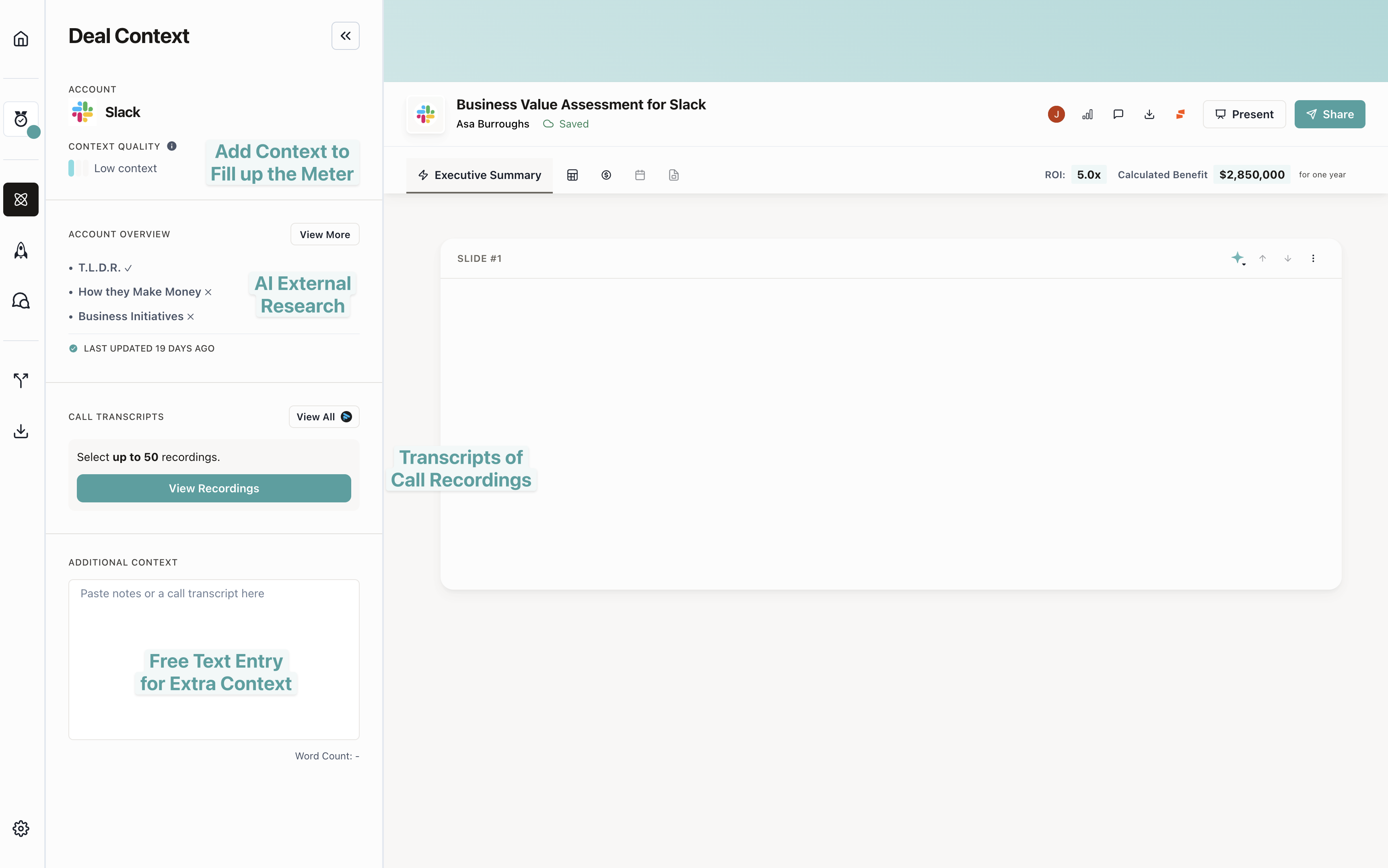 You have the option to export your business case as a slide deck with your branding. Slide exports can be a great way to leave an asset with your champion to share internally.- Click the export icon in the left toolbar of your business case
