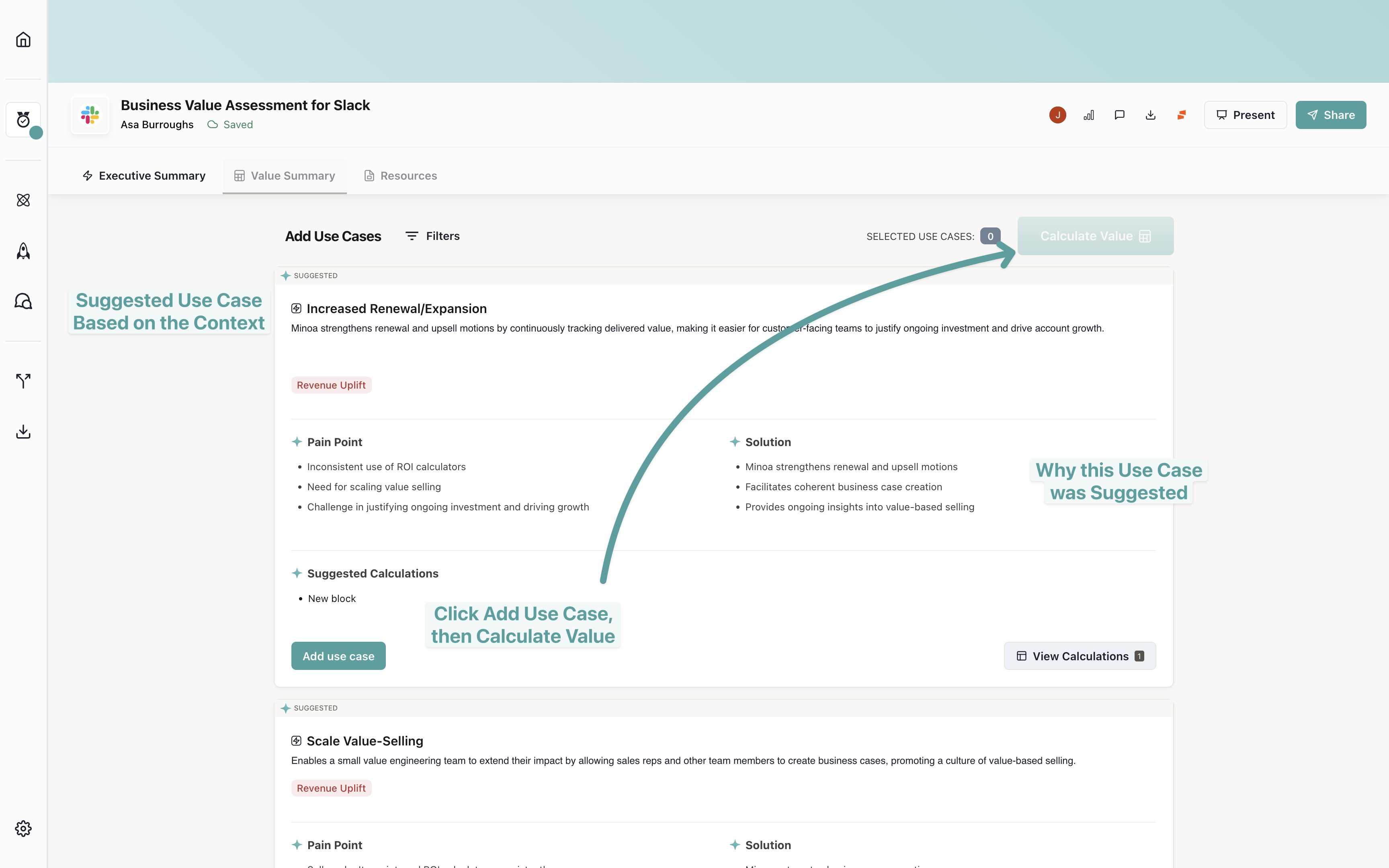 After adding context, you’ll choose use cases—pre-formatted calculations that translate your products into value-based language.- Review the Suggested Use Cases that Minoa AI recommends based on your context
