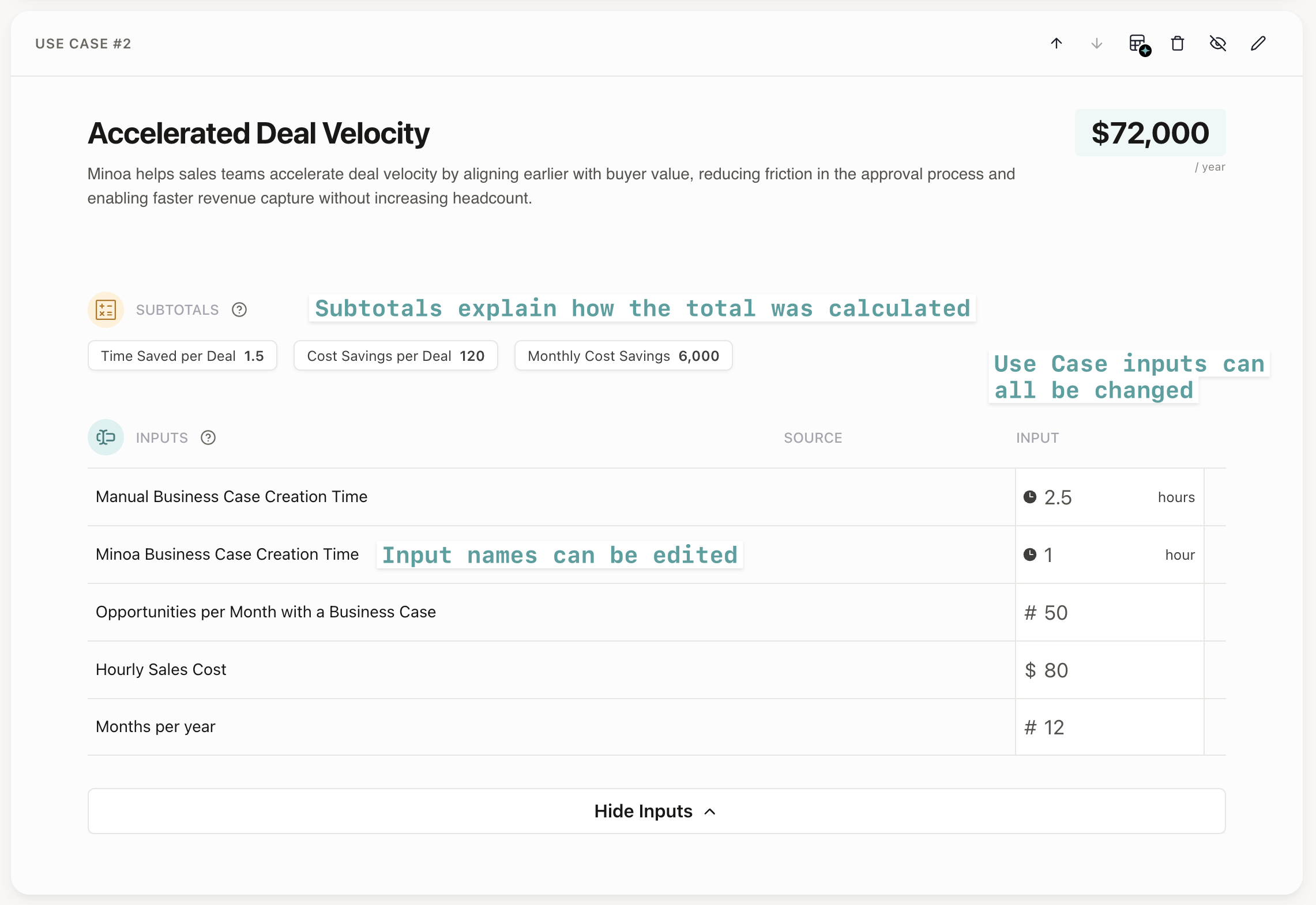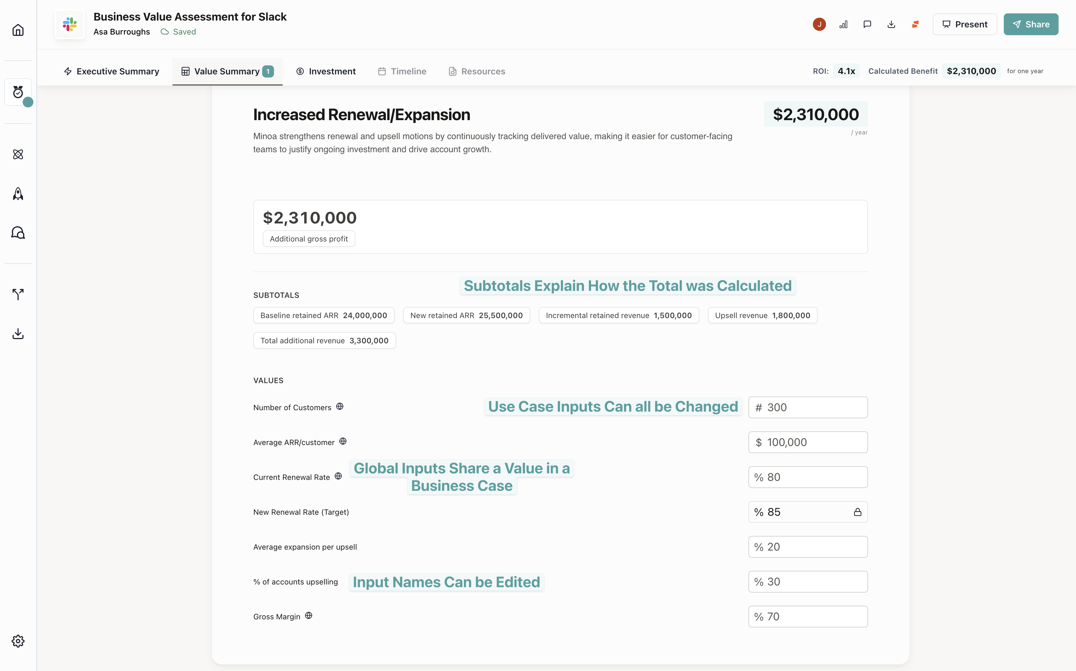 Use cases come with default values but they might not match your prospect’s business. You can change any of the inputs on one of your use cases to adjust the total benefit.- Navigate to the Calculation Tab