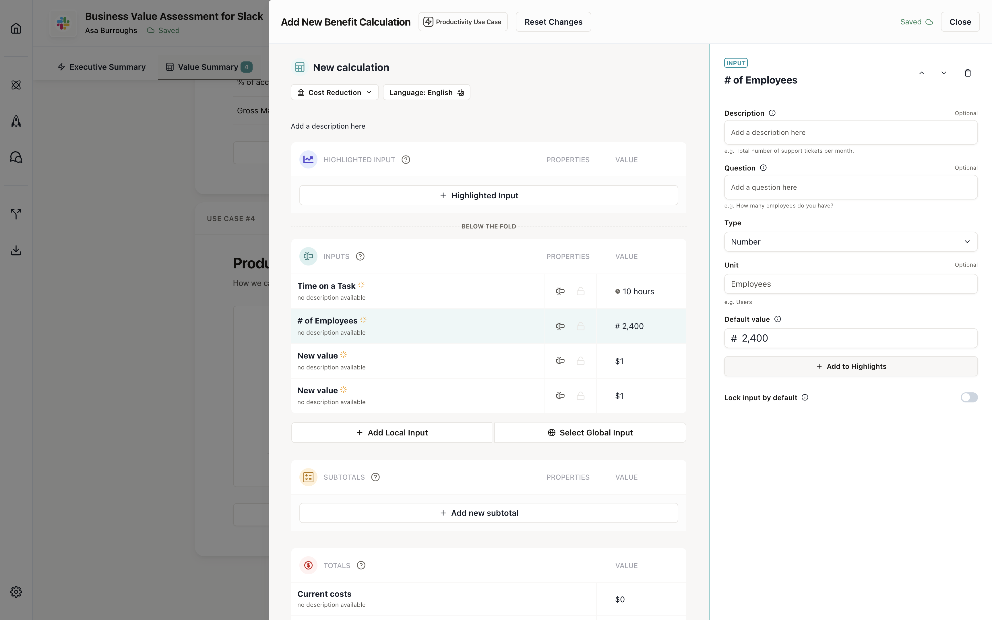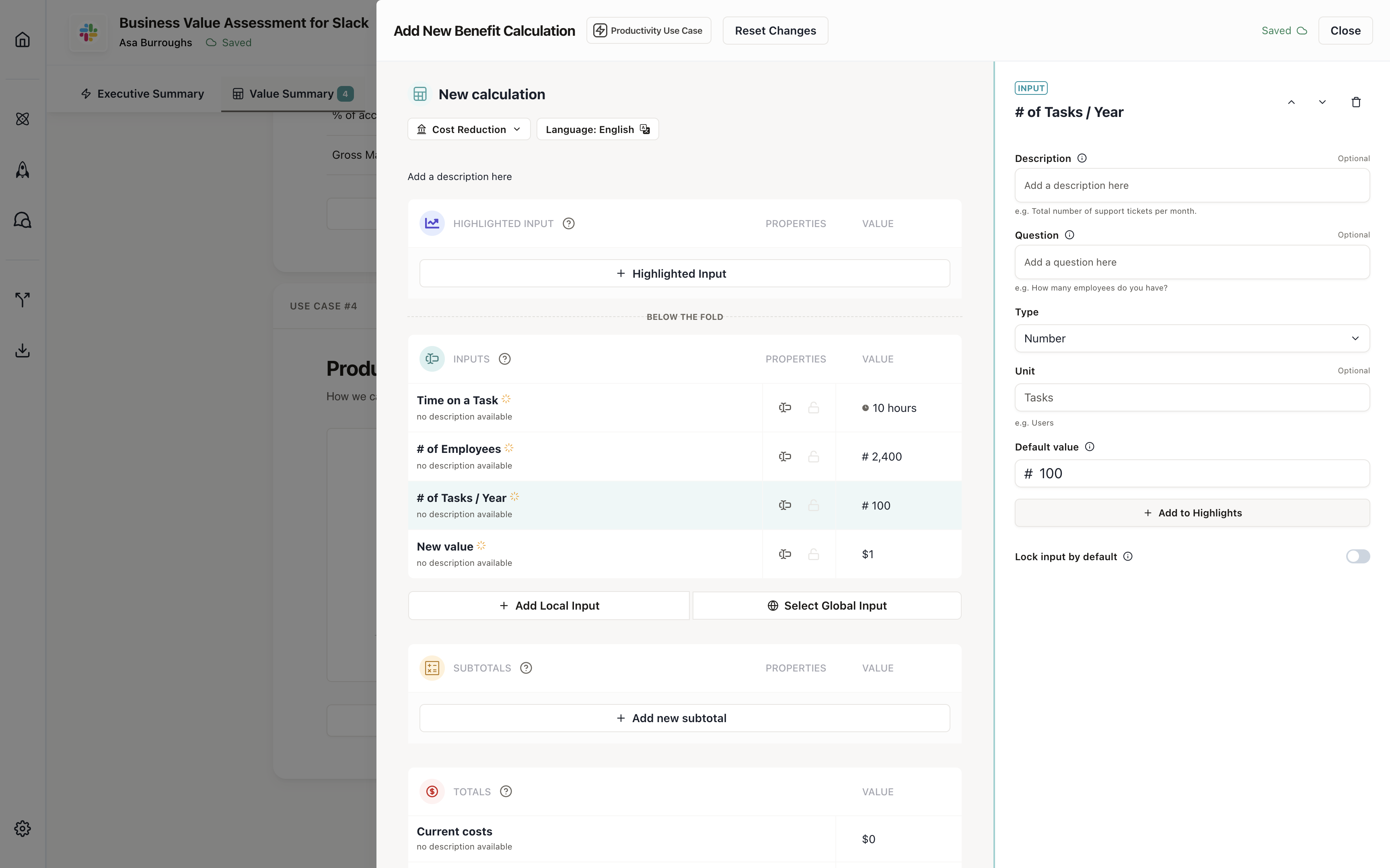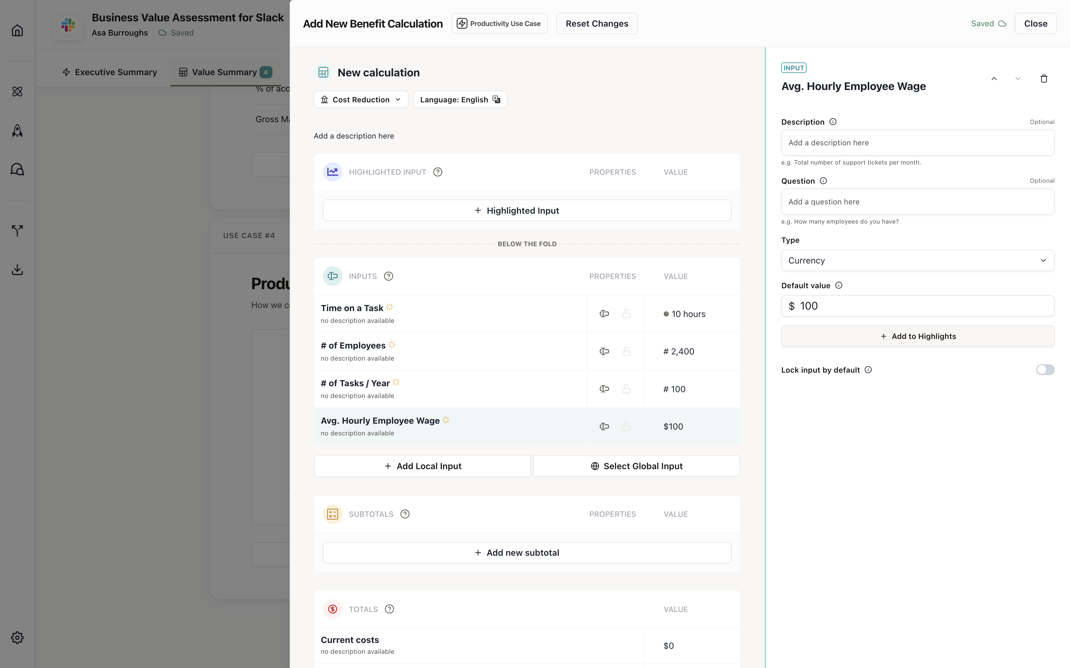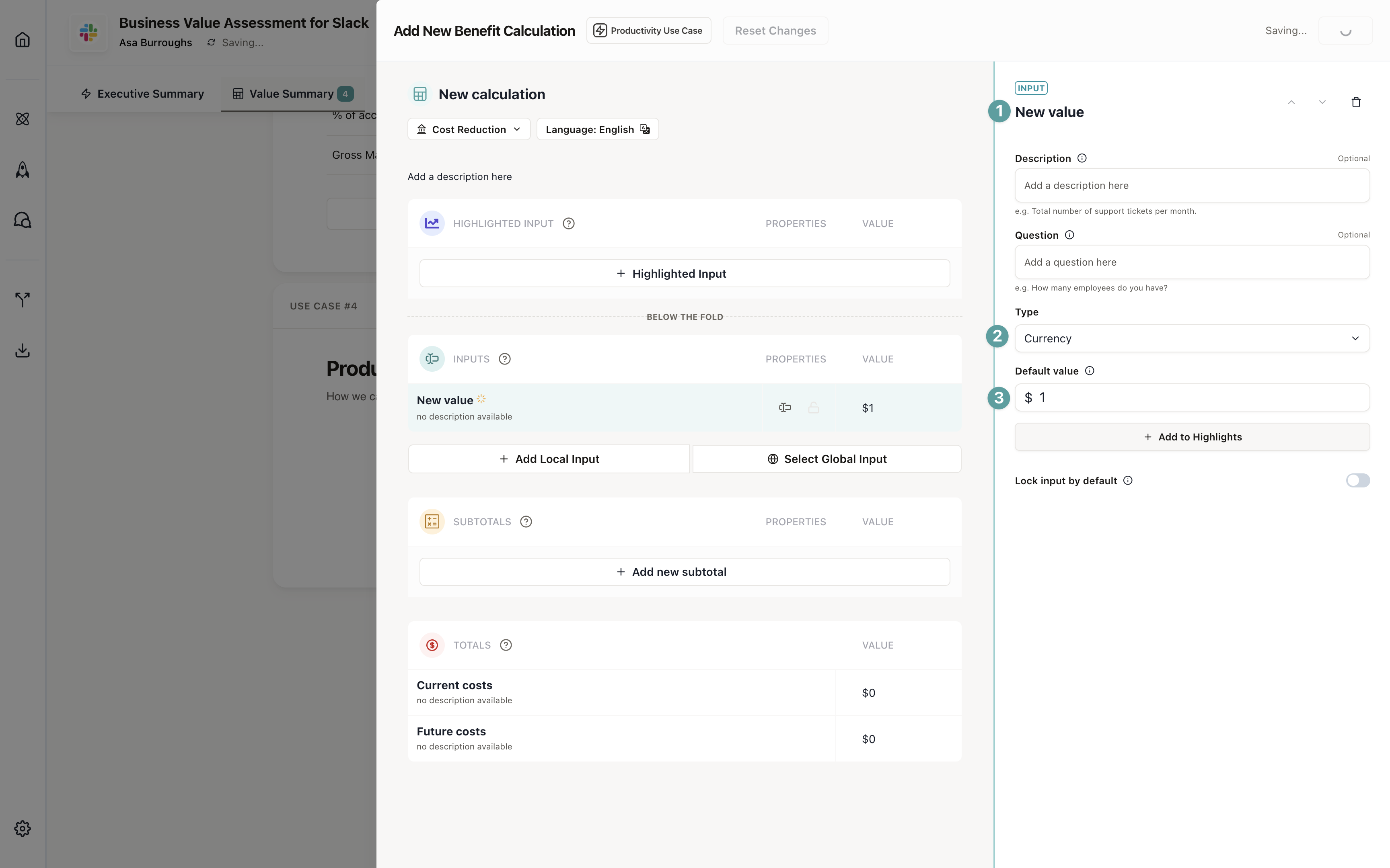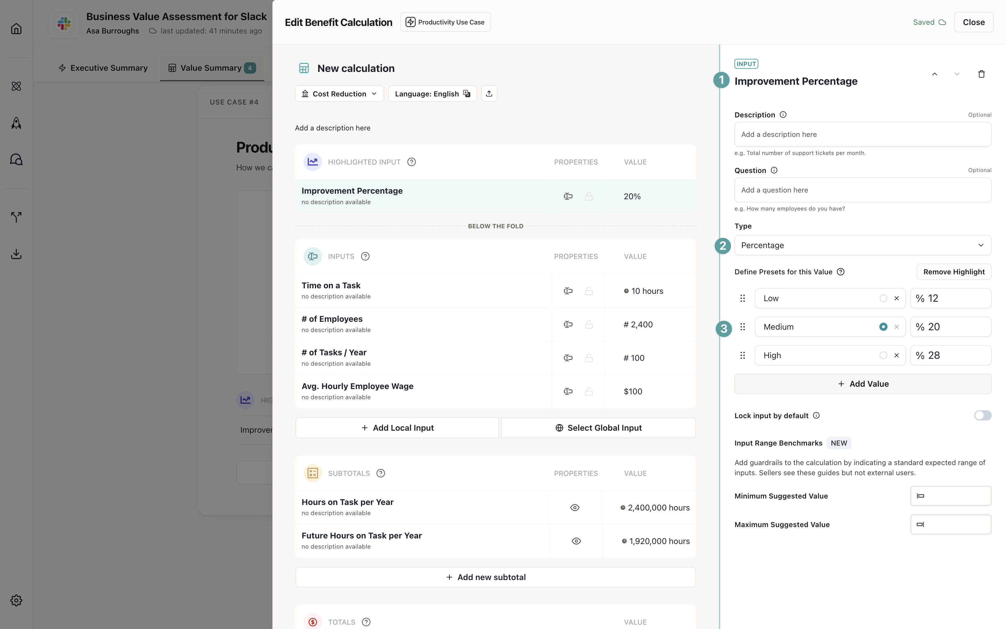 Highlighted inputs appear at the top of the input list on use case cards and are always visible. They’re perfect for improvement percentages or other key variables that drive the calculation. For this calculation, we’ll add an improvement percentage that shows how much more efficient your solution makes the task.- Click Add Input