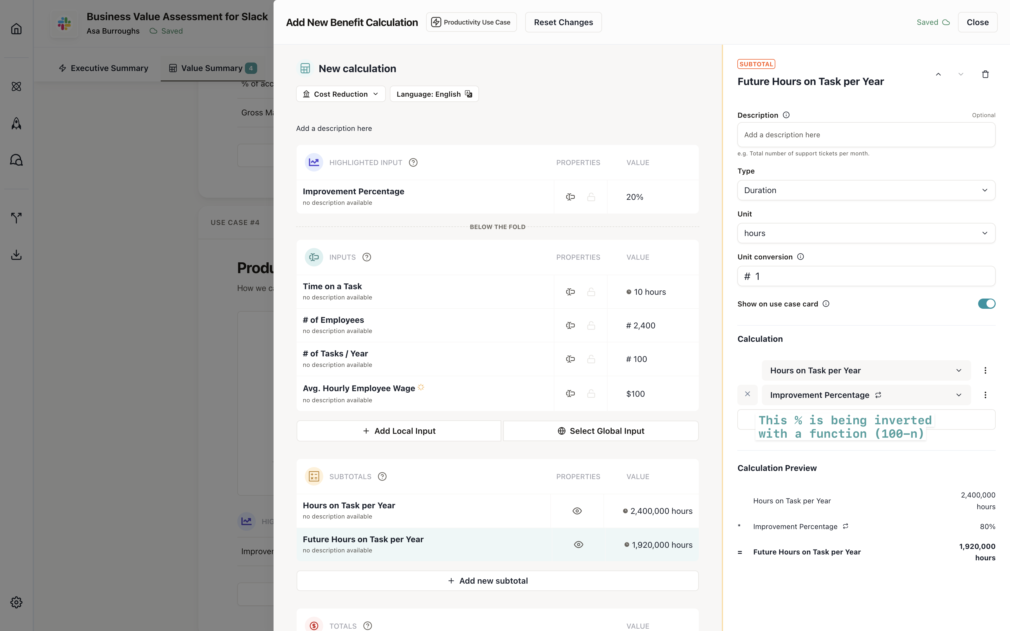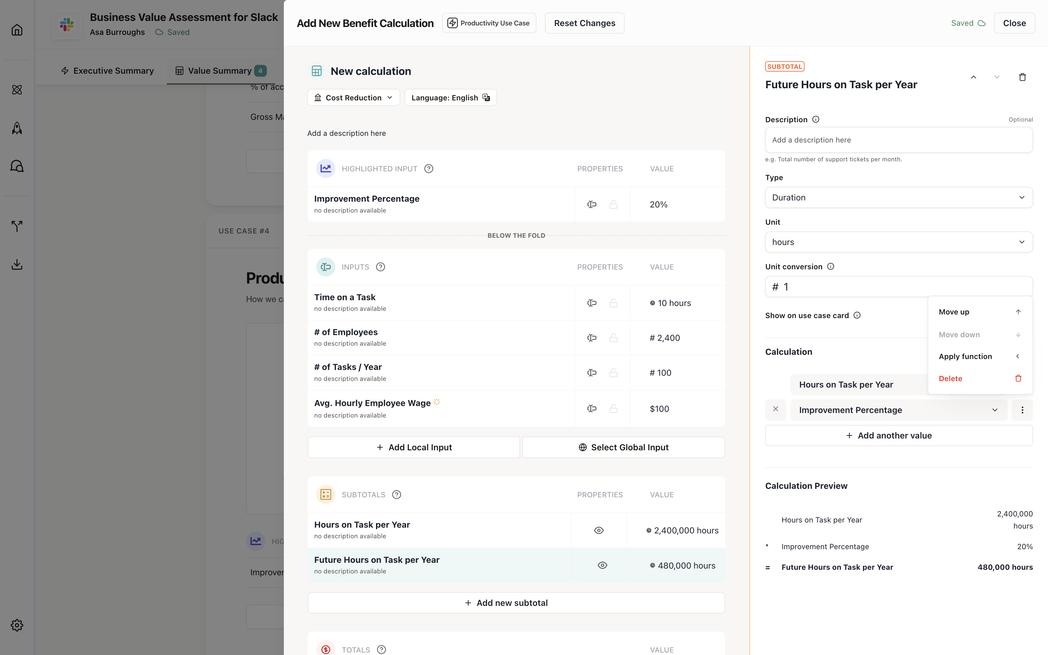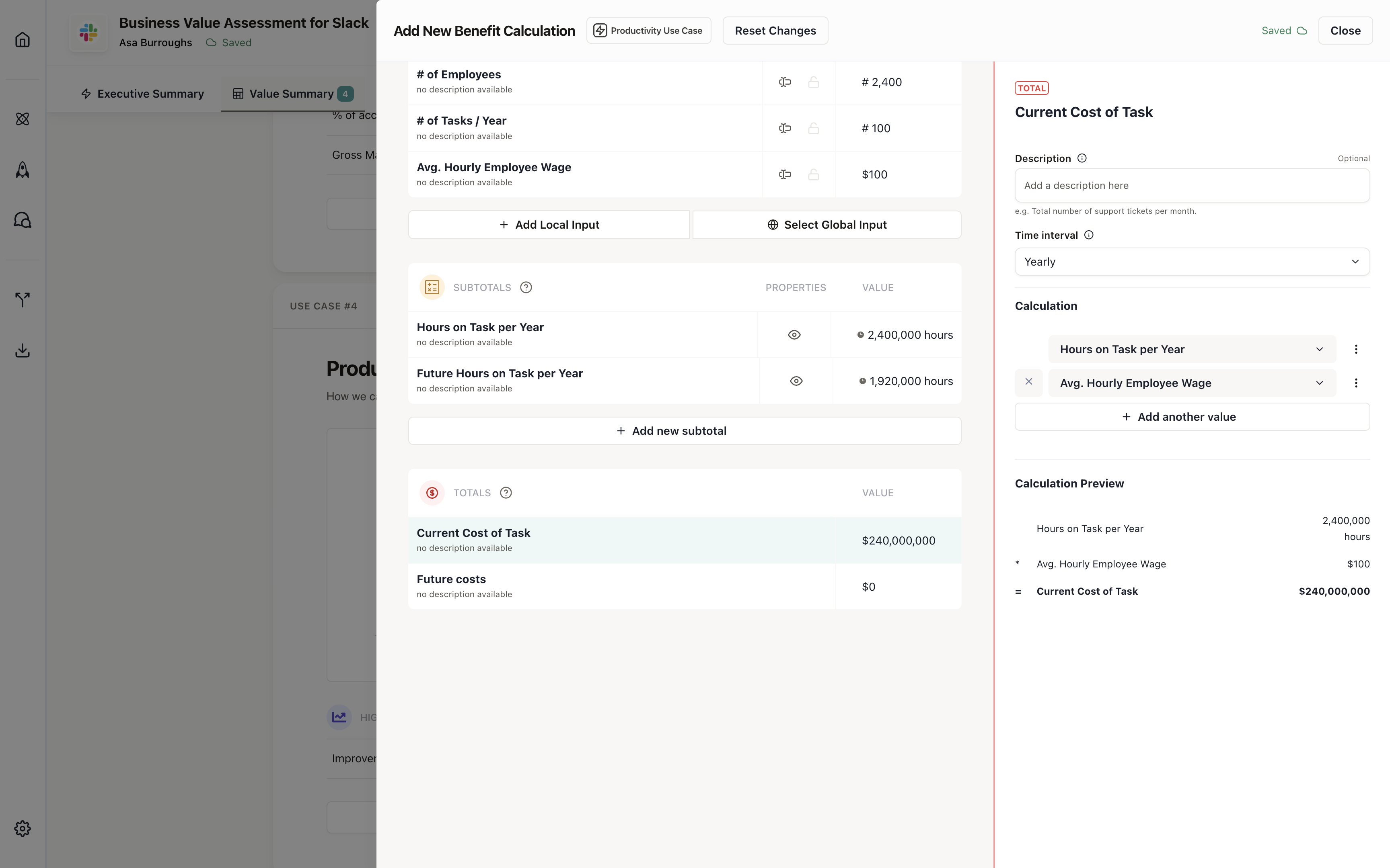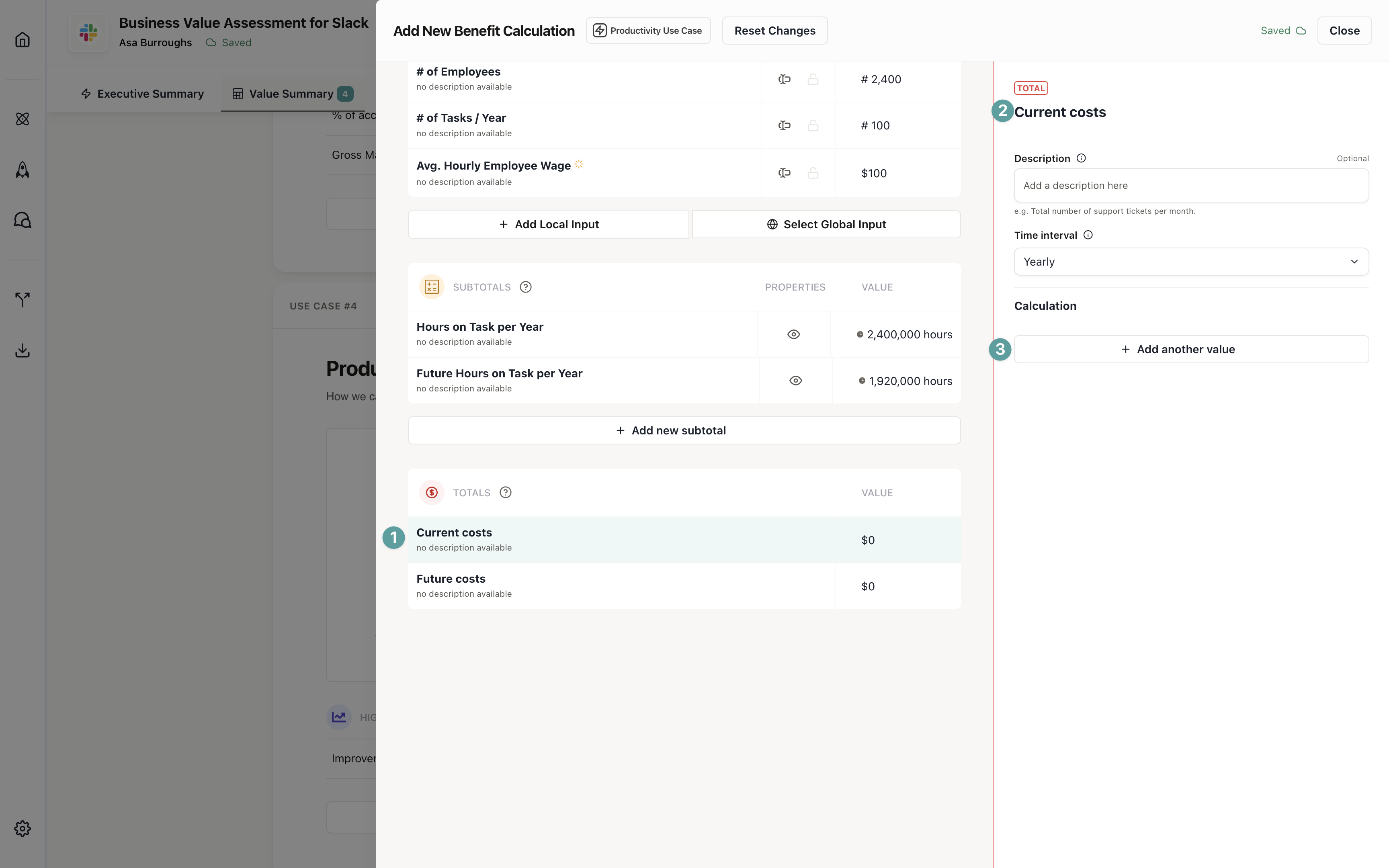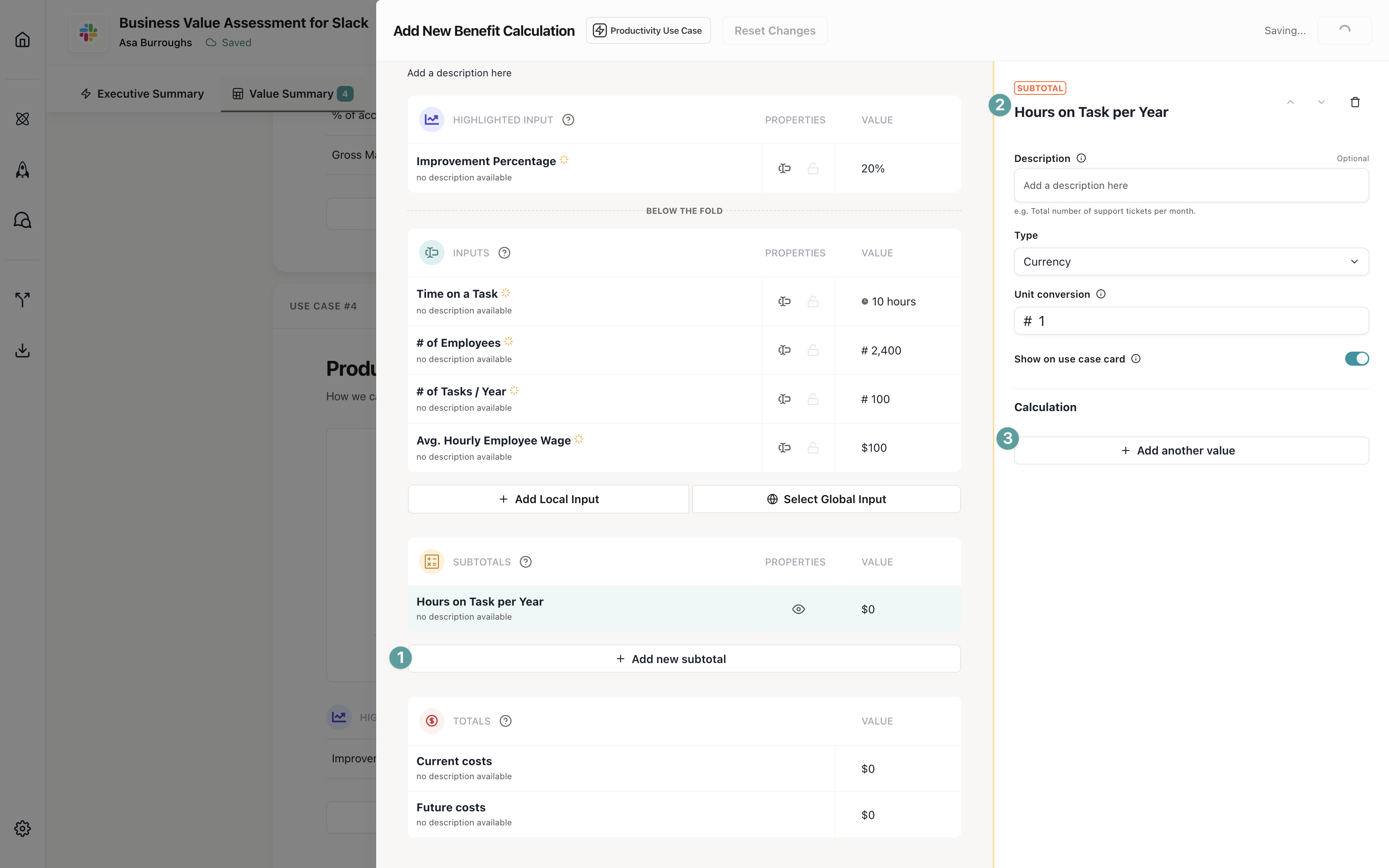 Subtotals combine multiple inputs to calculate intermediate values. For this calculation, we’ll create two subtotals:- Annual hours (current): Total hours spent on the task per year