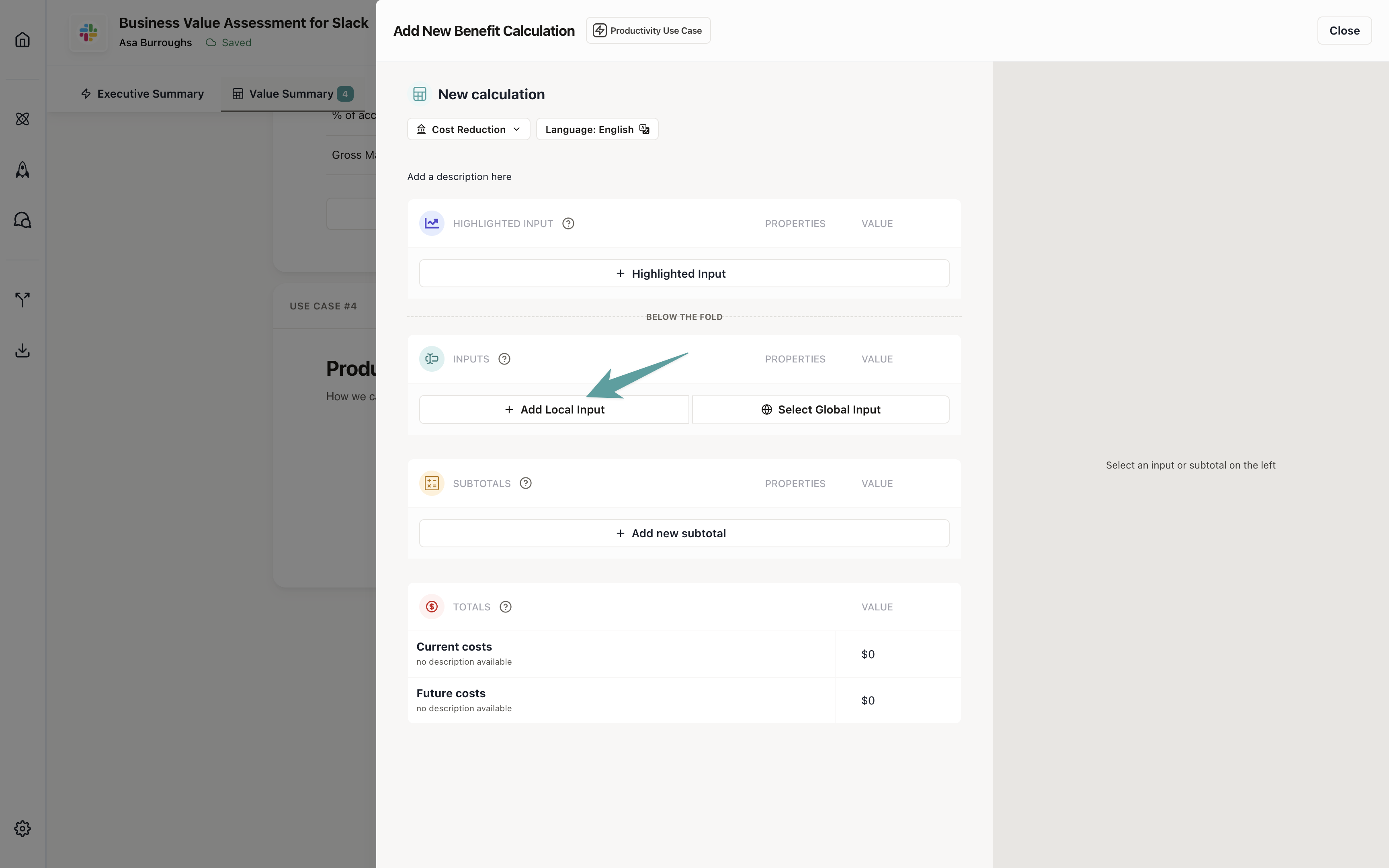 Inputs are the building blocks of your calculation. They represent the data points you need to quantify value.- Click Add Input